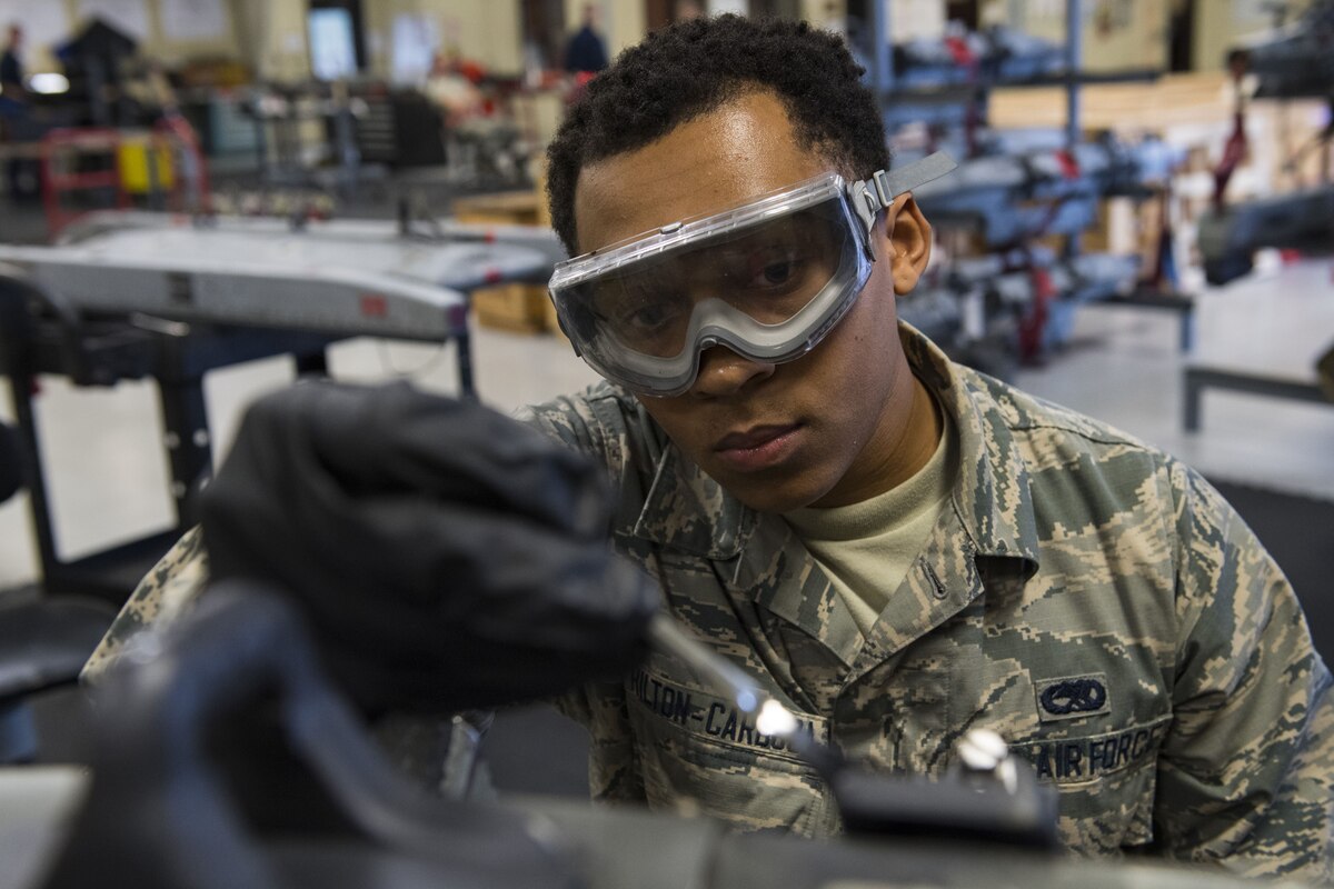 Airman 1st Class Joshua Mosel, 23d Maintenance Squadron armament journeyman, removes elements within a dual rail adapter, Jan. 9, 2018, at Moody Air Force Base, Ga. Moody’s armament flight is responsible for maintaining all of the aircraft weapons systems components when they're removed from the aircraft. This includes gun systems, alternate mission equipment and bomb racks. (U.S. Air Force photo by Senior Airman Janiqua P. Robinson)