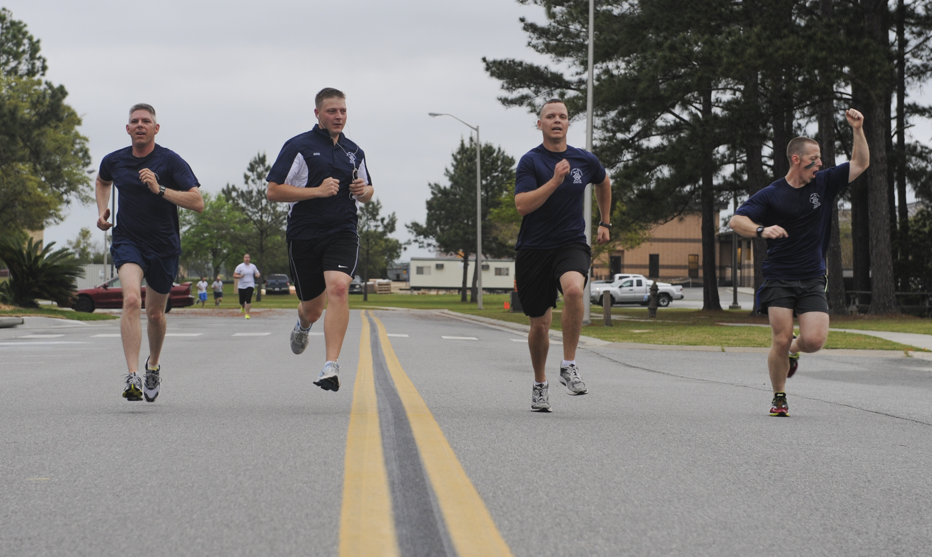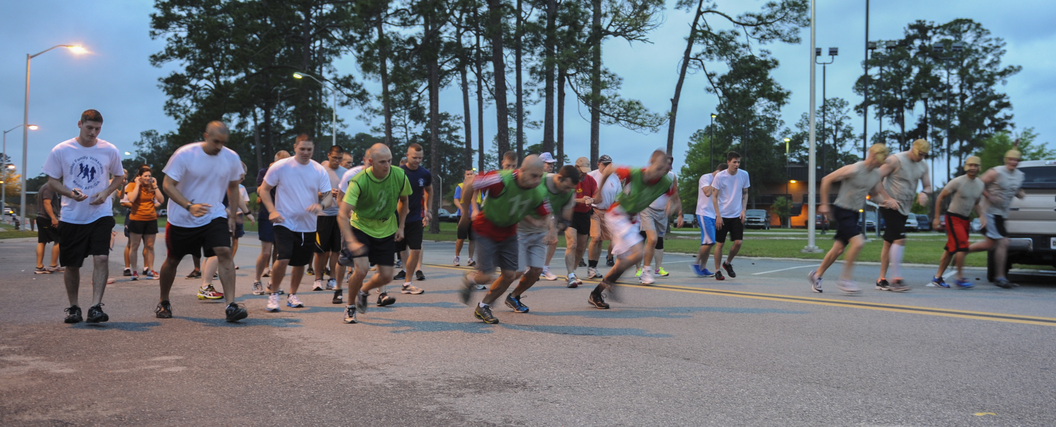 Members of Team Moody take off at the start of a Warrior 5K run April 12, 2013, at Moody Air Force Base, Ga. The 5K was a team race of groups of four, and all members had to cross the finish line before the groups’ time was announced. (U.S. Air Force photo by Airman Alexis Grotz/Released)