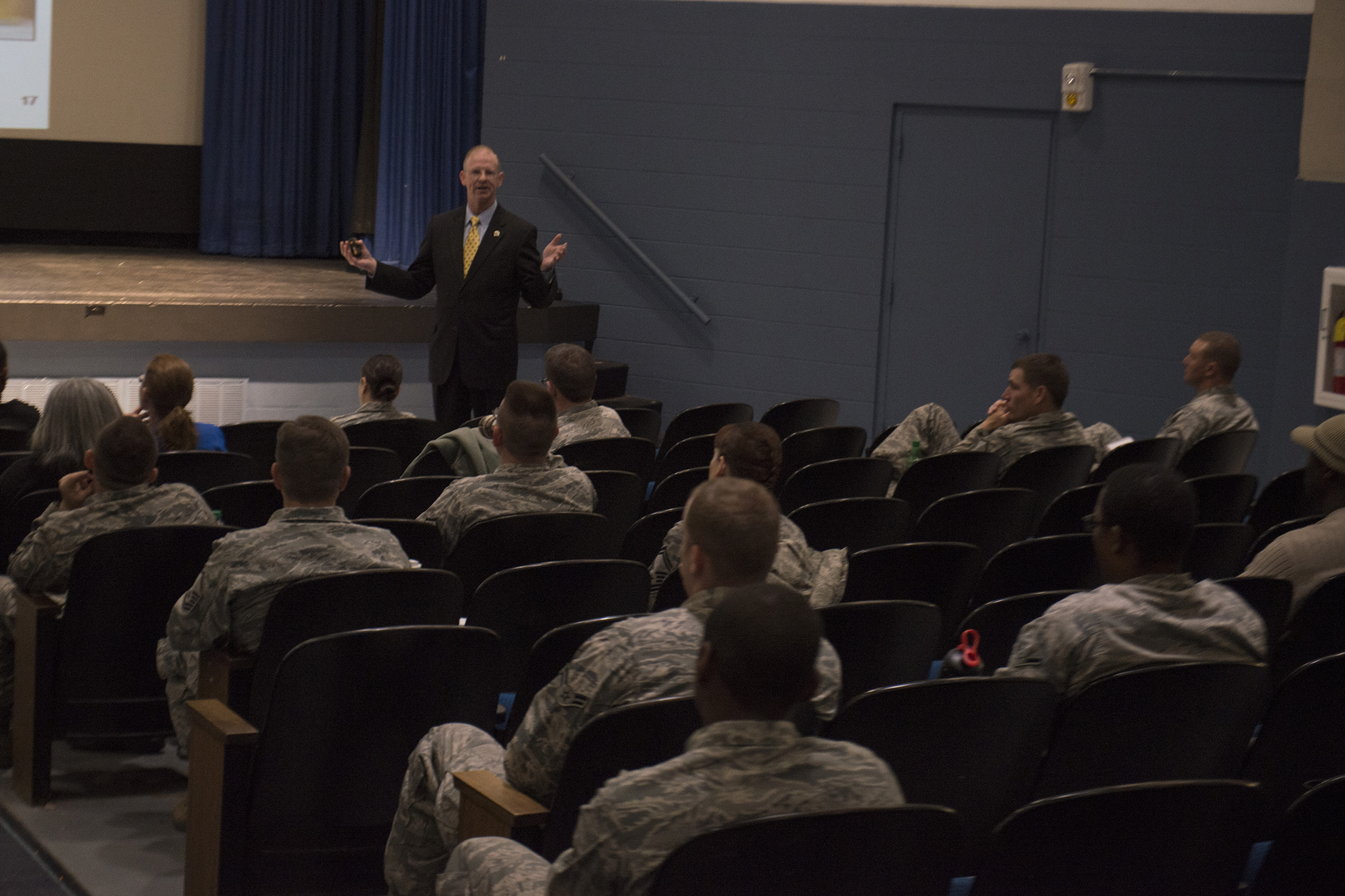 Retired U.S. Navy Capt. Jim O’Keefe, Military Officers Association of America deputy director, speaks during a Marketing Yourself for a Second Career brief April 5, 2013, at Moody Air Force Base, Ga. During the presentation, O’Keefe taught and shared tools to help Airmen successfully transition into a civilian career. (U.S. Air Force photo by Staff Sgt. Jamal D. Sutter/Released)