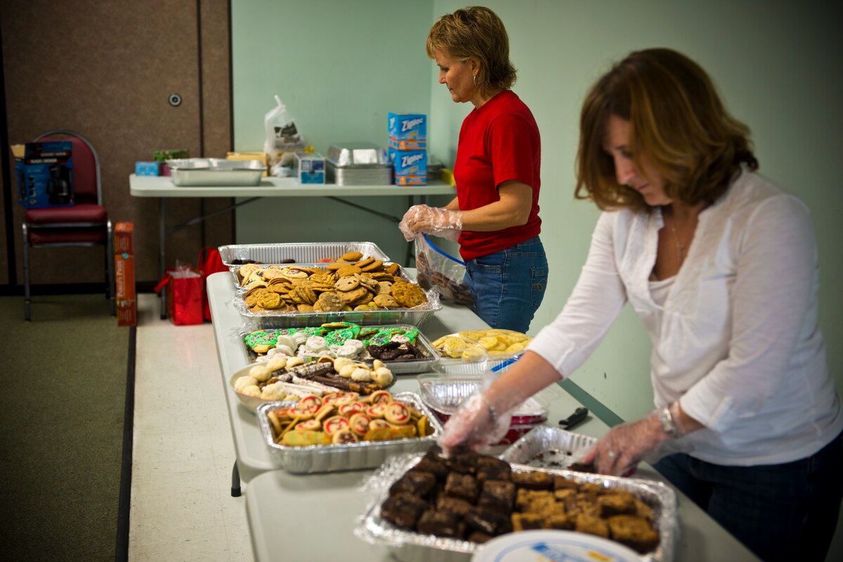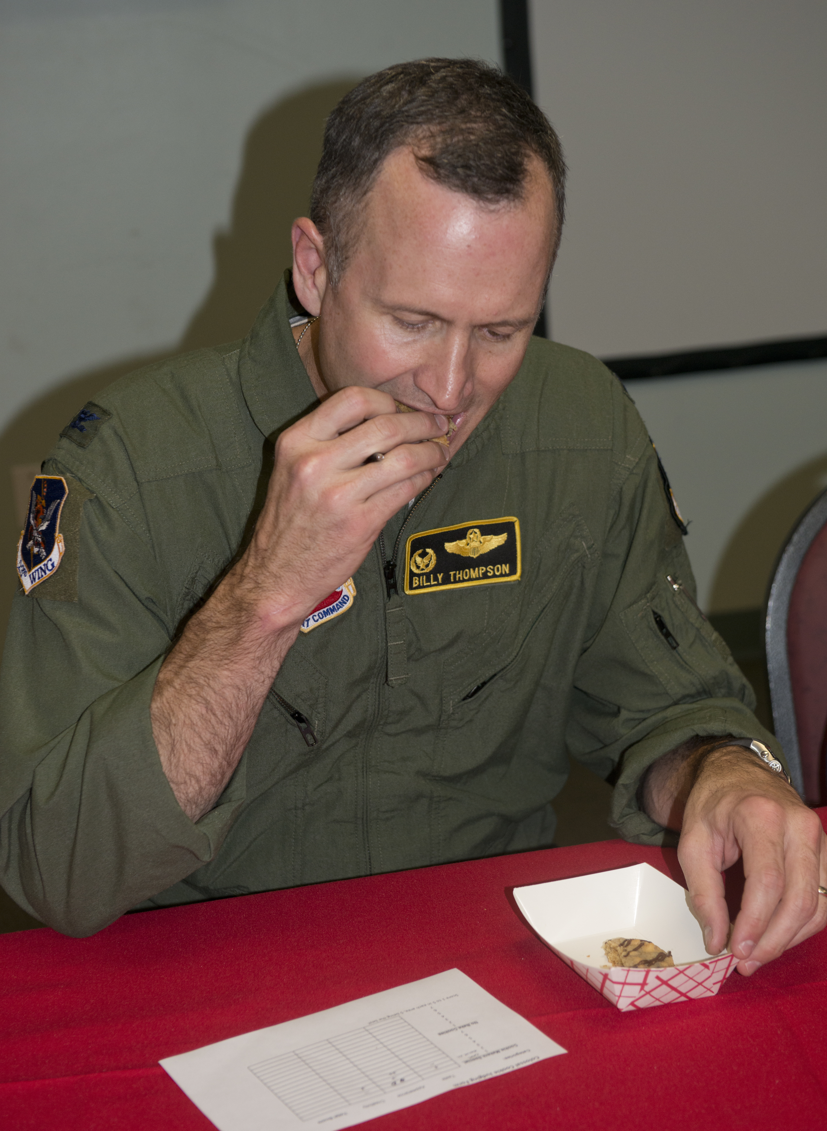 U.S. Air Force Senior Airman Michael Florio, 23d Operation Support Squadron intelligence targets journeyman, Col. Billy Thompson, 23d Wing commander, and 2nd Lt. Jacob Cannon, 23d Force Support Squadron deputy community services flight commander, tally the final scores during the Colossal Cookie competition at Moody Air Force Base, Ga., Dec. 3, 2012. The judges graded each cookie on taste, creativity and presentation. (U.S. Air Force photo by Airman 1st Class Paul Francis/Released)