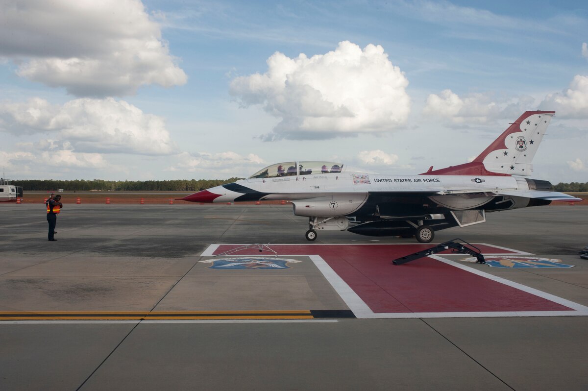 U.S. Air Force Lt. Col. Jason Koltes, Thunderbird 7 advanced pilot, and Jade Bulecza, WTXL reporter from Tallahassee, Fla., prepares for takeoff in an F-16C/D Fighting Falcon at Moody Air Force Base, Ga., Oct. 25, 2012.Bulecza received a taste of air power as part of the Thunderbirds Flight Demonstration Team media flight. (U.S. Air Force photo by Airman 1st Class Paul Francis/Released)
