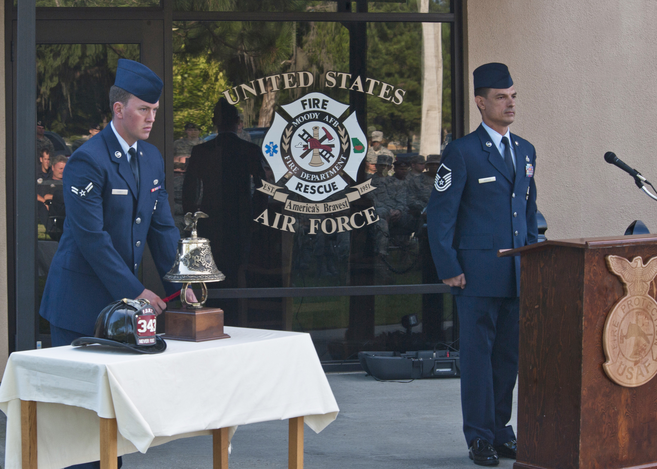 U.S. Air Force Airman 1st Class Donald Carey, 23d Civil Engineer Squadron firefighter, rings a traditional firefighter bell known as the “Last Call,” for the 9/11 Remembrance Ceremony Sept. 11, 2012, at Moody Air Force Base, Ga. The Last Call is held during funeral services and once also signaled the start and end of an alarm for firefighters. (U.S. Air Force photo by Senior Airman Eileen Meier/Released)