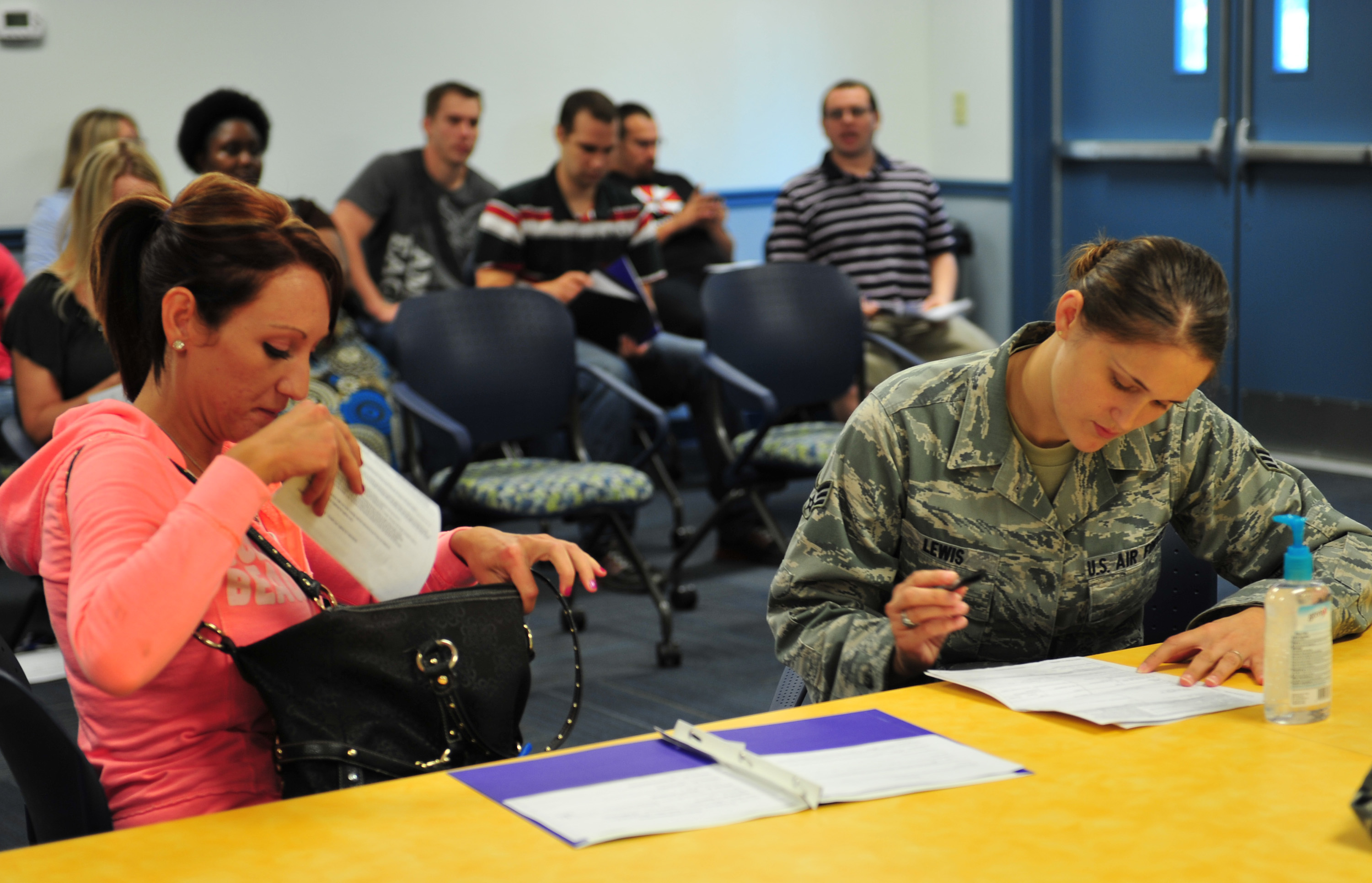 U.S. Air Force Senior Airman Jennifer Lewis, 23d Aerospace Medicine Squadron aerospace medical technician, performs a medical screening on Elizabeth Frymier during the 2012 Individual Ready Reserve (IRR) Muster at Moody Air Force Base, Ga., Aug. 18, 2012. The IRR Muster is one of three continuous Pre-trained Individual Manpower screening programs mandated by law and managed by the Air Reserve Personnel Center at Buckley AFB, Colorado used to enhance the readiness and reporting of this vital Strategic Reserve asset. (U.S. Air Force photo by Staff Sgt. Stephanie Mancha/ Released)