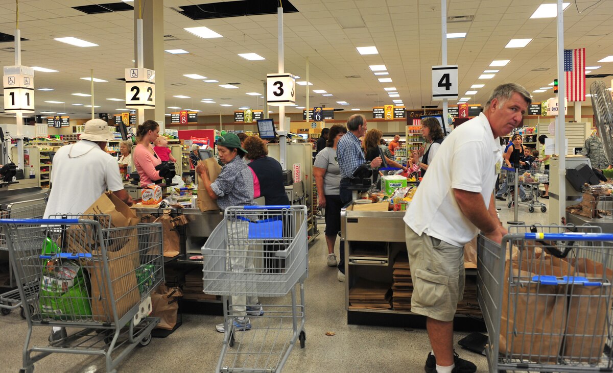 Military members, spouses and retirees stand in the checkout line in the remodeled commissary at Moody Air Force Base, Ga., Oct. 19, 2011. The commissary opened their doors today after being closed for two days to prepare for the reopening. During the reopening, prizes were given away to customers to include bikes, gift cards and professional football tickets. (U.S. Air Force photo by Staff Sgt. Stephanie Mancha/Released)