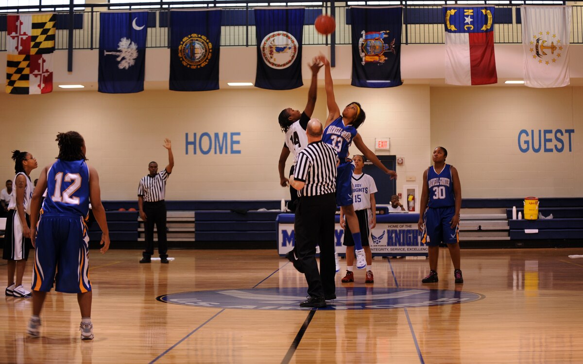 MOODY AIR FORCE BASE, Ga. -- Altanee Manor, Moody’s “Lady Knights” varsity basketball team member, attempts to win the tip-off against a player from Maxwell Air Force Base, Ala., Feb. 5. Though the “Maxwell-Gunter” team won the tip- off, Ashley Searcy, Lady Knights shooting guard, made the first basket of the game. (U.S. Air Force photo/Airman 1st Class Douglas Ellis)(RELEASED)