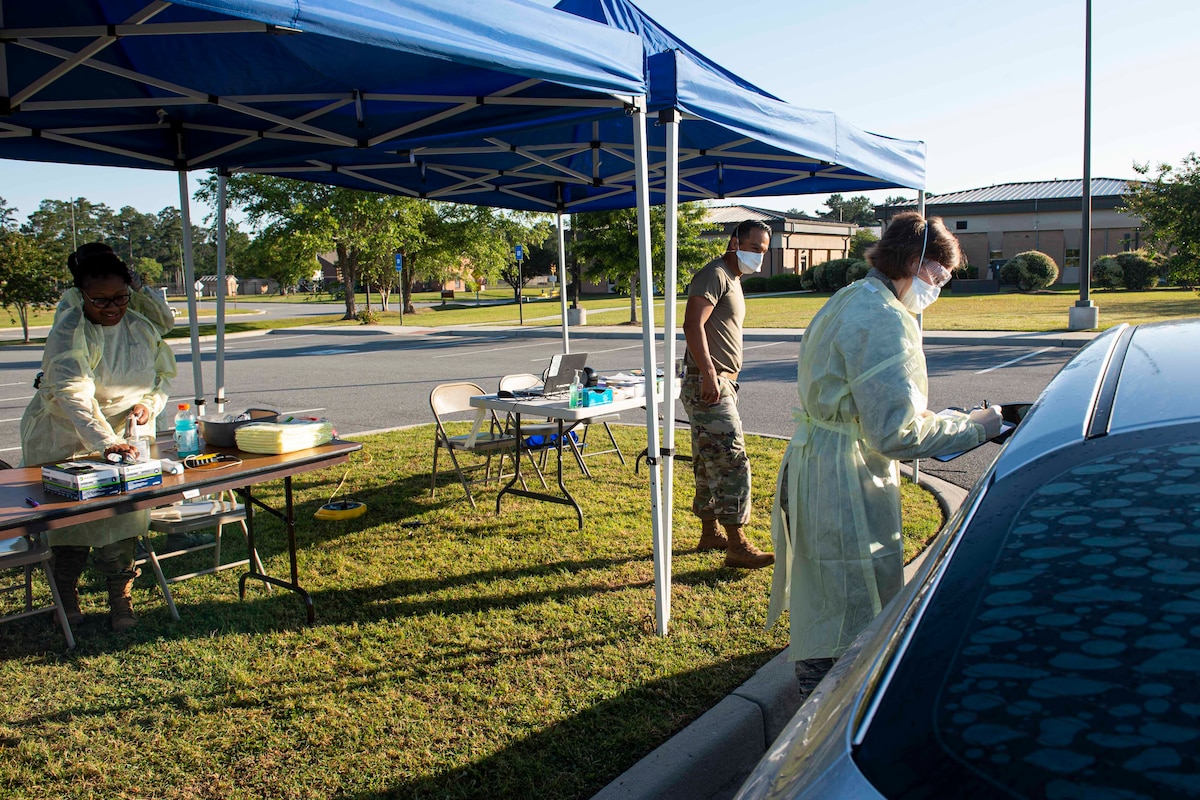 Staff Sgt. Tamara Myers, 75th Fighter Squadron independent duty medical technician, sanitizes a table for a COVID-19 Tier 2 screening May 11, 2020, at Moody Air Force Base, Georgia. The COVID-19 Tier 2 screening is part of an ongoing response to limit the spread of the virus and recently moved from the Davidson Gate to the 23d Medical Group parking lot. (U.S. Air Force photo by Airman 1st Class Azaria E. Foster)