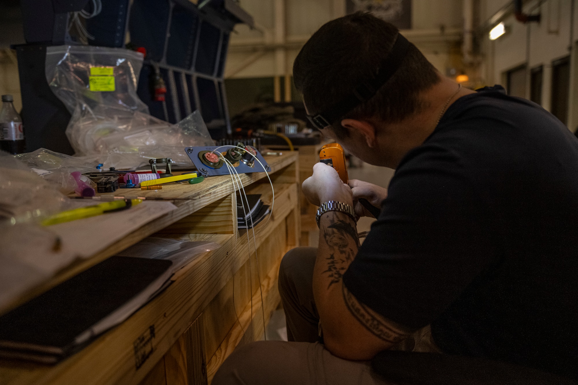 A new combat systems officer station shell sits on a table at Moody Air Force Base, Georgia, Jan. 25, 2024. Combat systems officers are typically responsible for the operation and coordination of weapons and sensor systems on aircraft, navigation, target identification and overall mission planning. The station and software upgrades will support Link 16, a tactical data network system that can establish communication between aircraft to create a full picture of a battlespace. (U.S. Air Force photo by Senior Airman Deanna Muir)