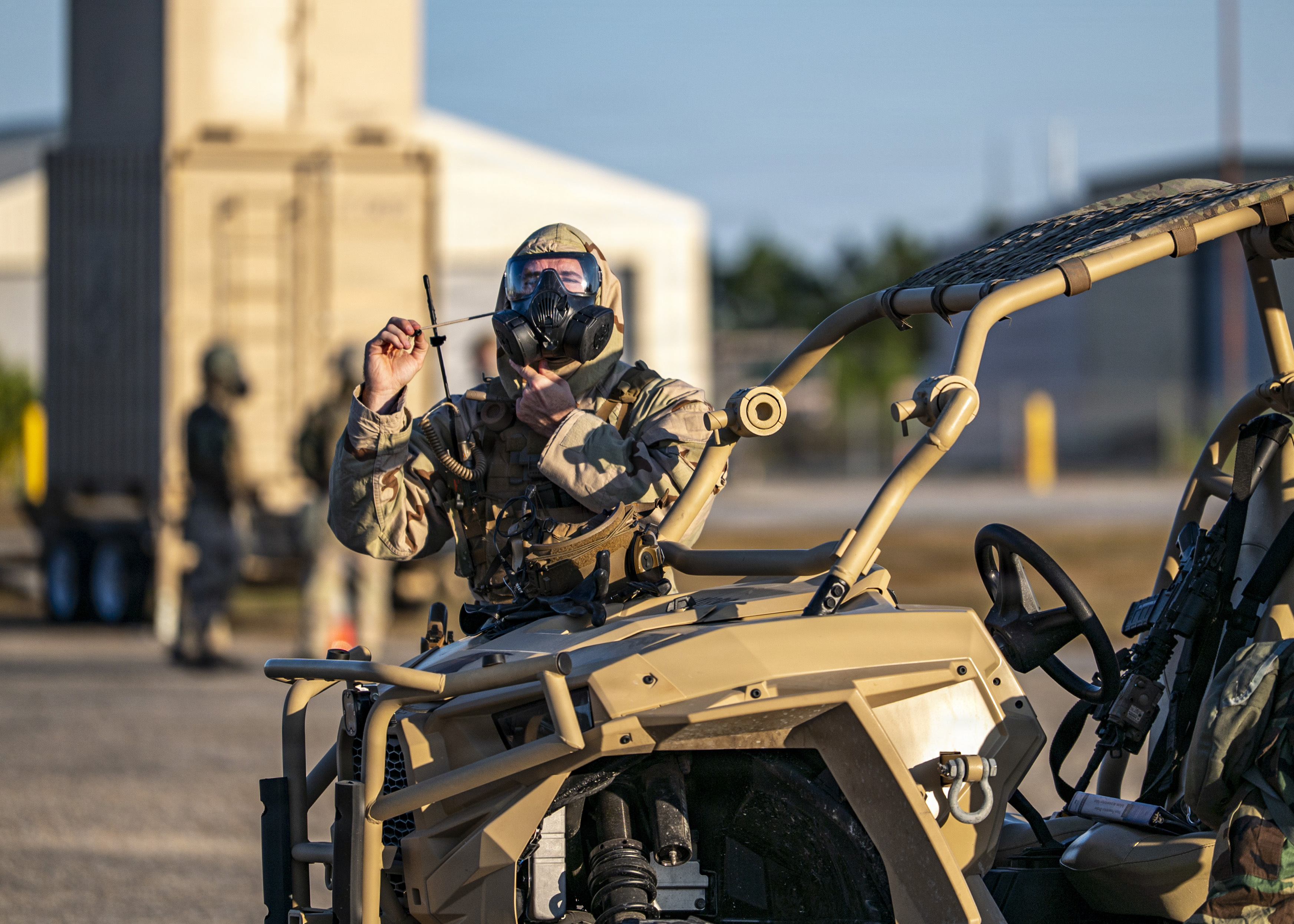 “ALARM RED, MOPP 4” echoed over the loudspeaker and through all radio channels across the site, prompting exercise players to don their chemical protective gear. The plume, later identified as mustard gas, continued to blow downwind directly into the wing operations center.