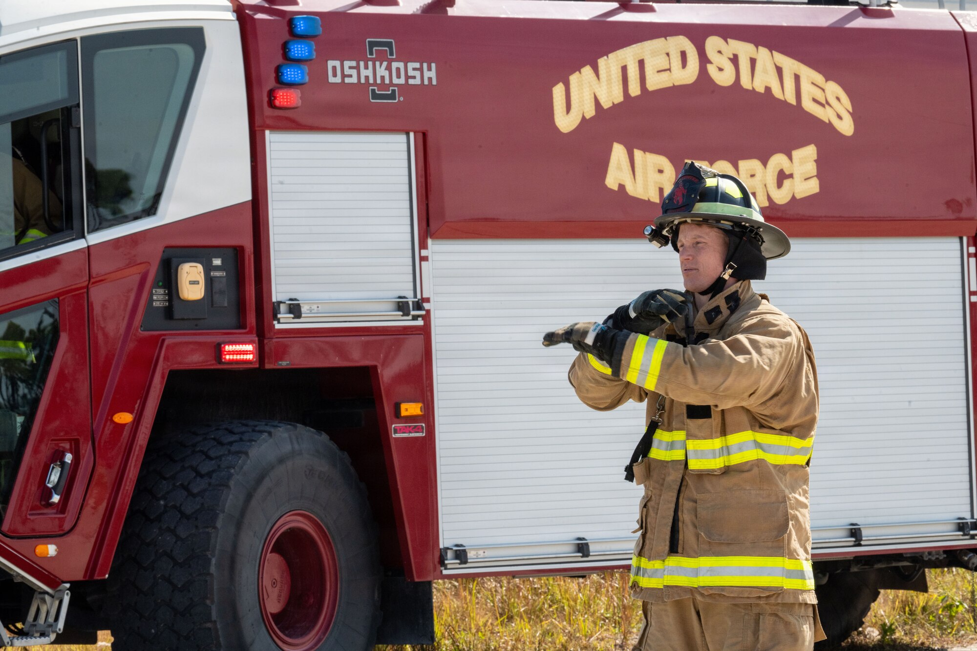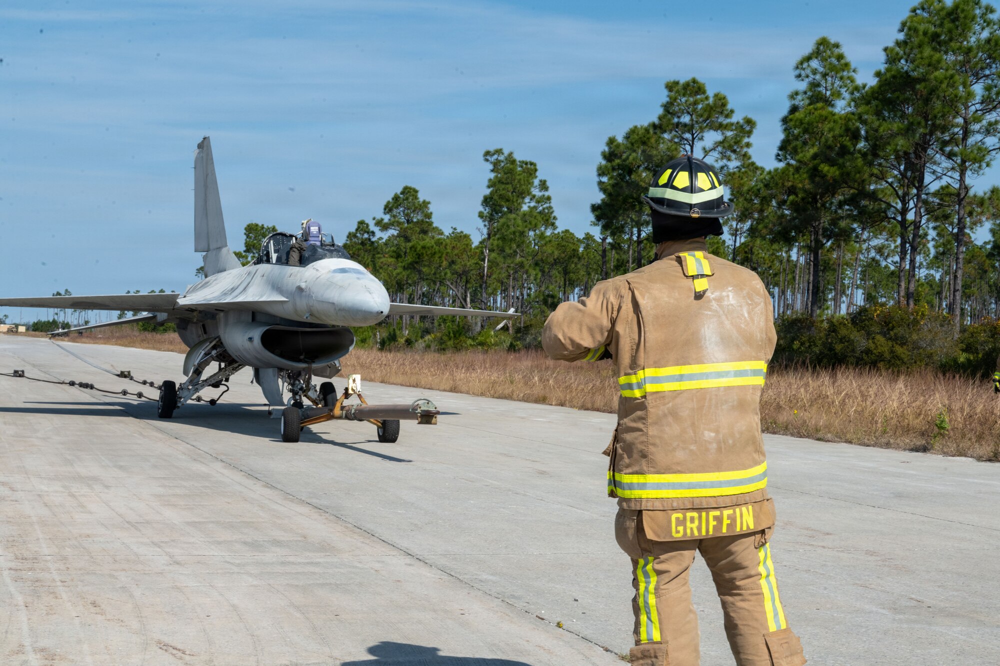 A U.S. Air Force Airman from the 23d Civil Engineer Squadron fire department helps direct response operations during a simulated aircraft crash during exercise Mosaic Tiger 26-1 at Tyndall Air Force Base, Florida, Nov. 18, 2025. The exercise challenged Airmen to operate as a cohesive, multi-capable force, strengthening the trust, communication and adaptability needed to generate airpower in austere environments. (U.S. Air Force photo by Staff Sgt. Sari Seibert)