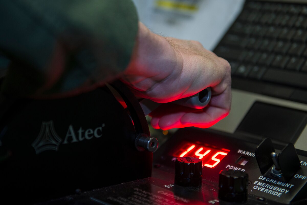 U.S. Air Force Chief Master Sgt. David Kelch, 23d Wing command chief, left, and Tech. Sgt. Dallas Morris, 23d Component Maintenance Squadron aerospace propulsion craftsman, share a laugh during a TF-34 engine run, Feb. 12, 2016, at Moody Air Force Base, Ga. Wing leadership visited the ‘hush house’, a building designed to test aircraft engines while significantly reducing noise output. (U.S. Air Force photo by Airman 1st Class Greg Nash/Released)
