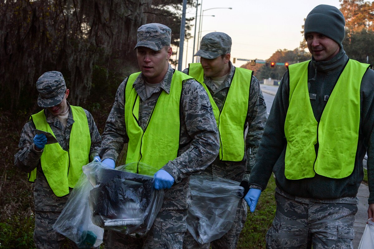 U.S. Air Force Airman 1st Class Jordon Rogers, 23d Operations Support Squadron air traffic control apprentice, places a garbage bag in a collection truck, Jan. 12, 2016, at Moody Air Force Base, Ga. During the patrol, a vehicle made rounds collecting full bags of trash from volunteers. (U.S. Air Force photo by Airman 1st Class Janiqua P. Robinson/Released)