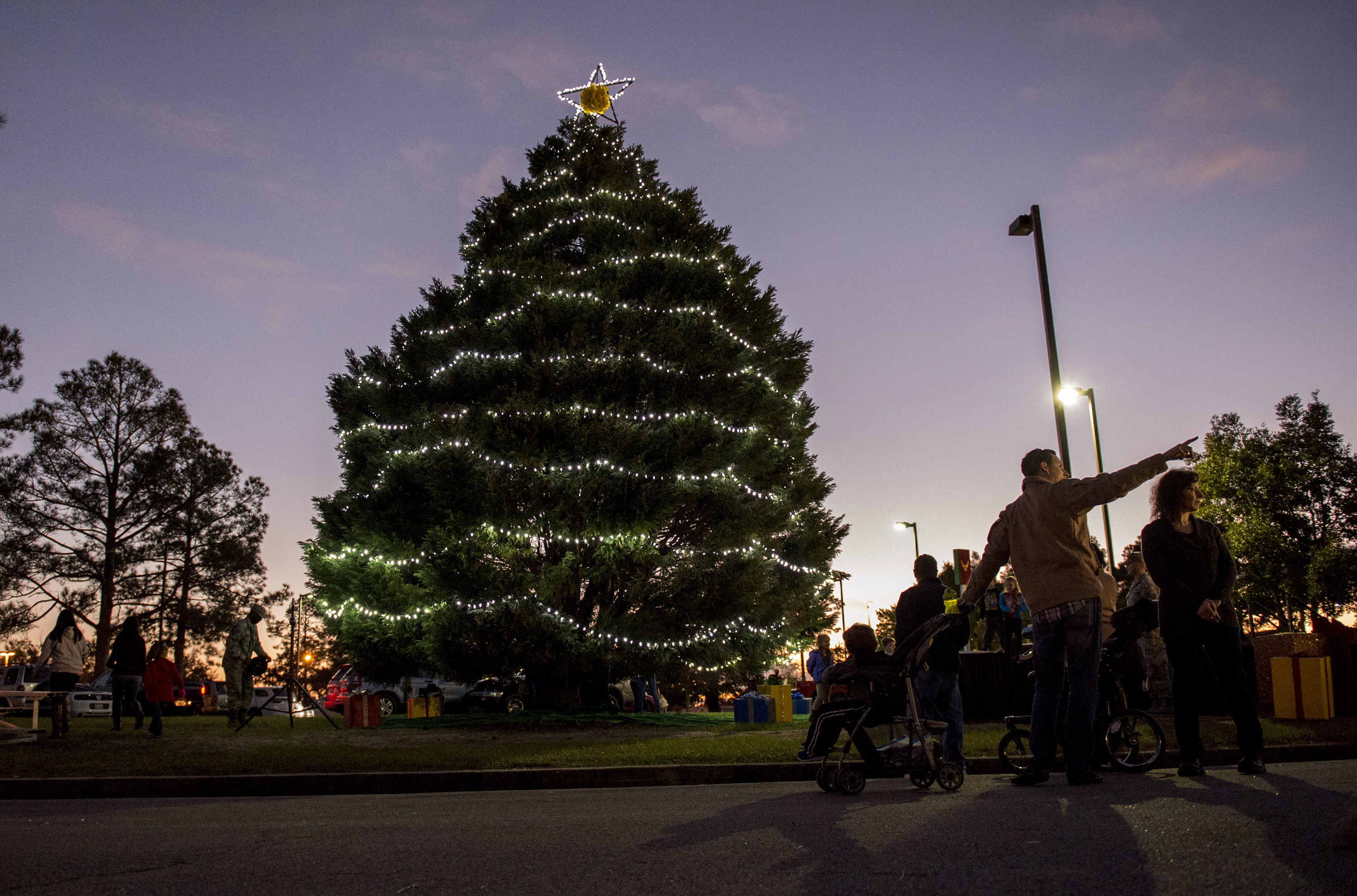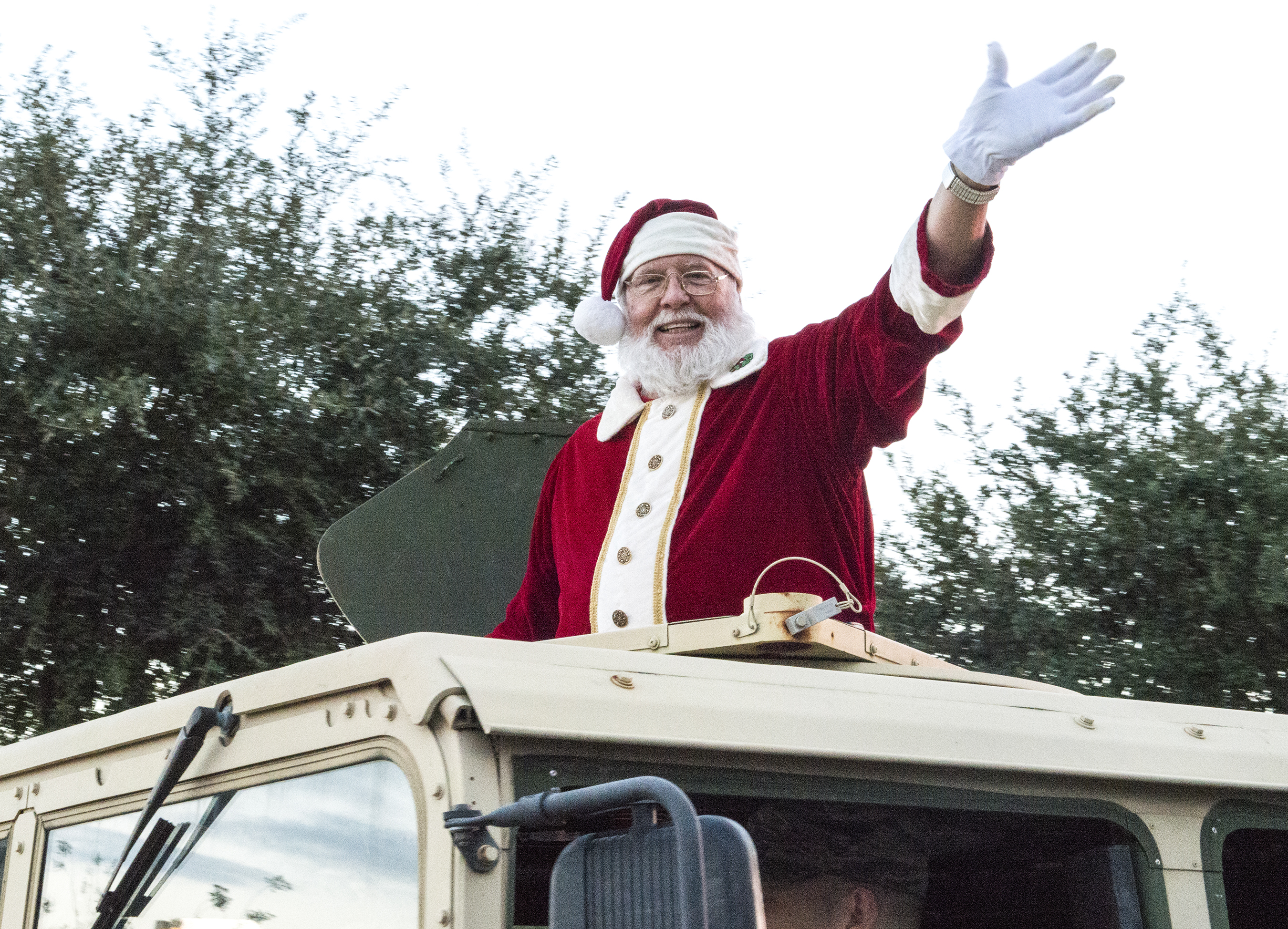 Chief Master Sgt. David Kelch, 23d Wing command chief, throws candy to attendees of the tree-lighting ceremony, Dec. 4, 2015, at Moody Air Force Base, Ga. Members of leadership and different base and community organizations marched in a parade and tossed candy to the crowd before lighting the tree. (U.S. Air Force photo/Tech. Sgt. Zachary Wolf)