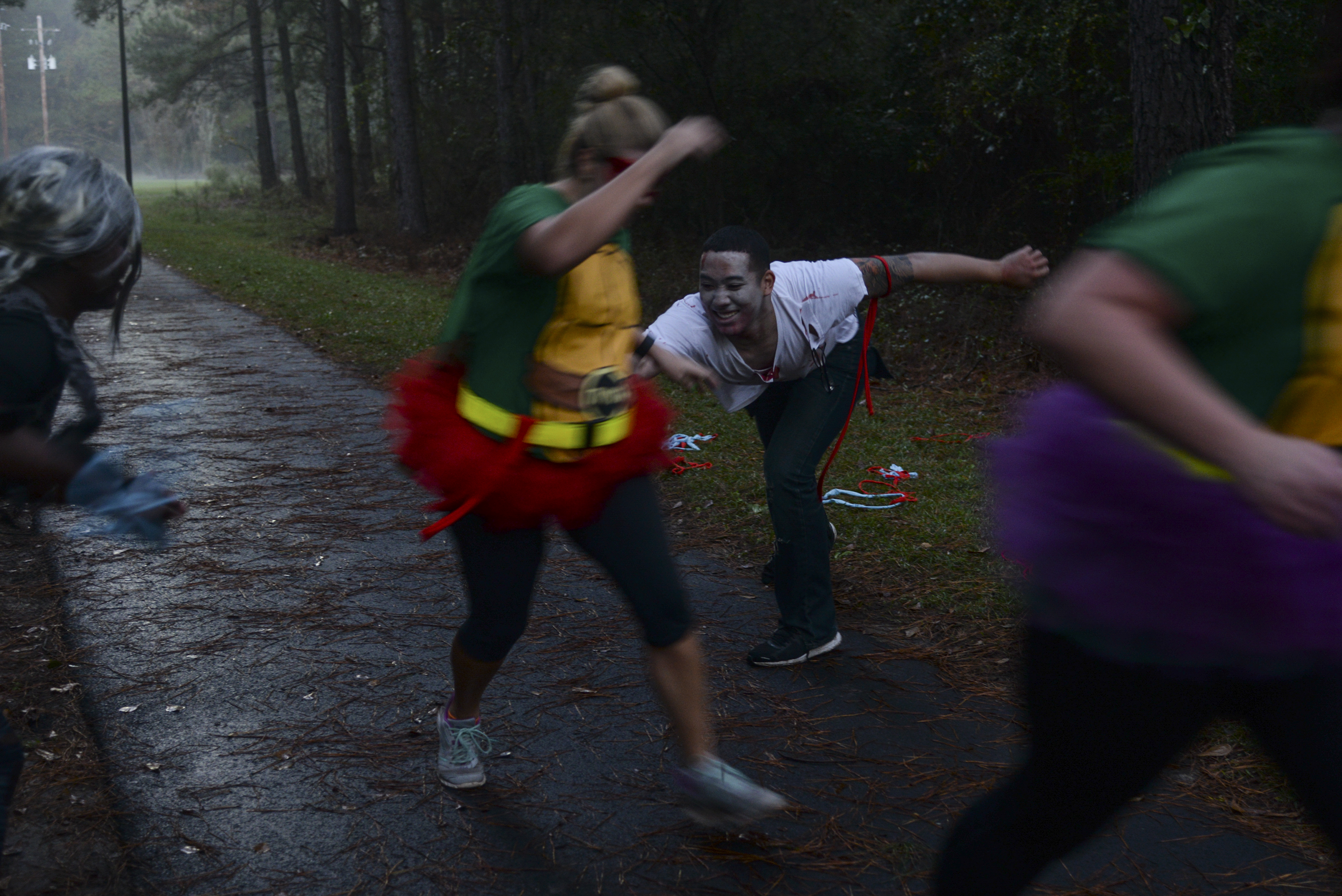 U.S. Air Force Airman 1st Class Jarid Kreiser and his wife, Amber, shuffle back to the starting line after the Zombie Run Oct. 30, 2015, at Moody Air Force Base, Ga. Runners were given two flags, representing runners’ lives, zombies had to take during the 5K run. (U.S. Air Force photo by Airman 1st Class Janiqua P. Robinson/Released)