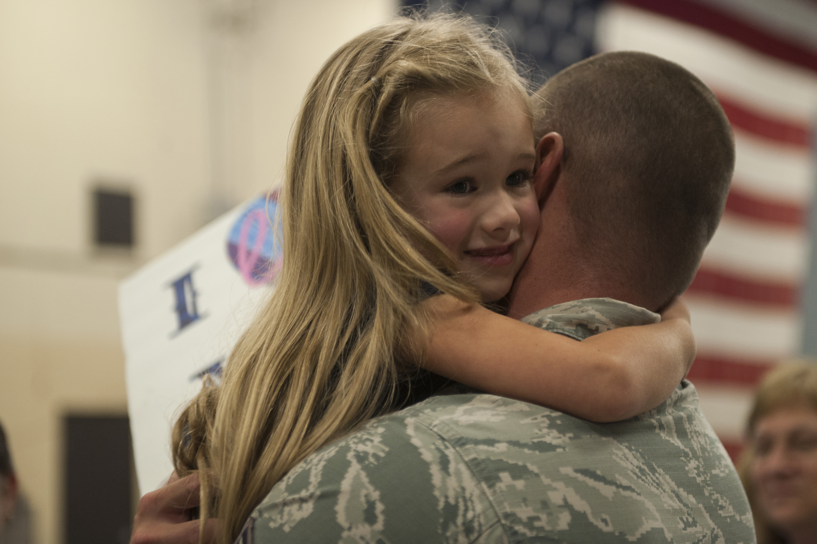 U.S. Air Force Staff Sgt. Dallas Ayers, 823d Base Defense Squadron unit deployment manager, embraces his daughter, Addison, during a re-deployment ceremony, Oct. 27, 2015, at Moody Air Force Base, Ga. The 820th Base Defense Group provides planning, training, equipping and preparation to three security forces squadrons, one of which is the 823d BDS. (U.S. Air Force photo by Airman 1st Class Kathleen D. Bryant/Released)