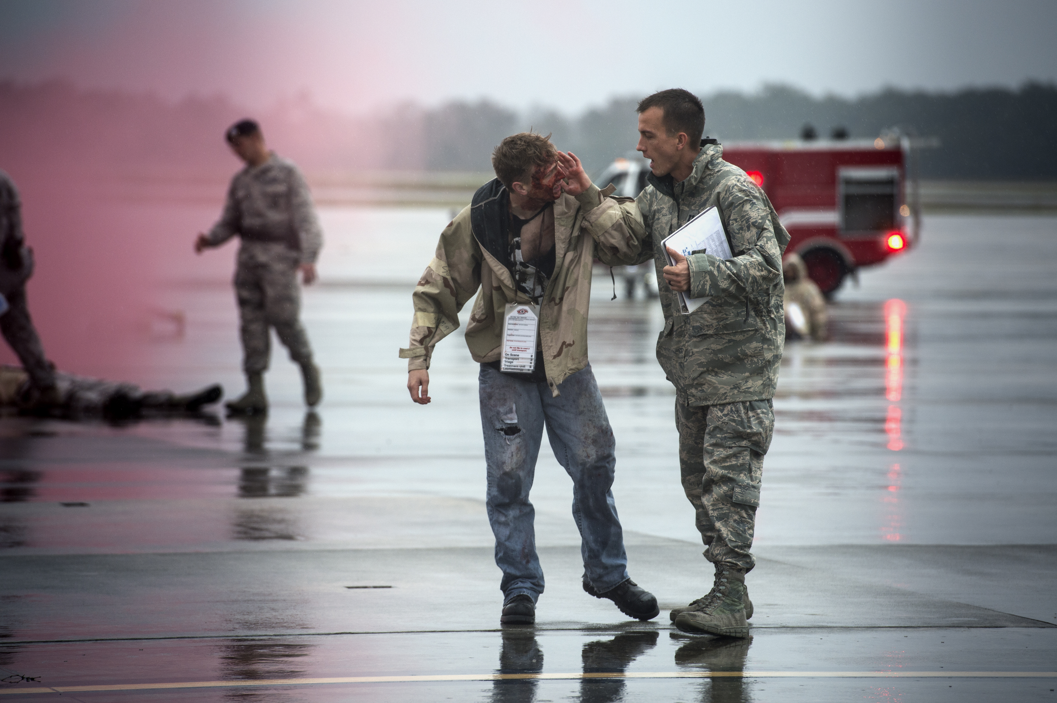 U.S. Air Force Maj. Saudah Muhammad, 23d Medical Operations Squadron family health flight commander, tends to a patient during a major accident response exercise, Oct. 27, 2015, at Moody Air Force Base, Ga. The exercise was designed to test a wide spectrum of Moody’s capabilities including responding to an aircraft crash and treating patients on-scene. (U.S. Air Force photo by Senior Airman Ryan Callaghan/Released)