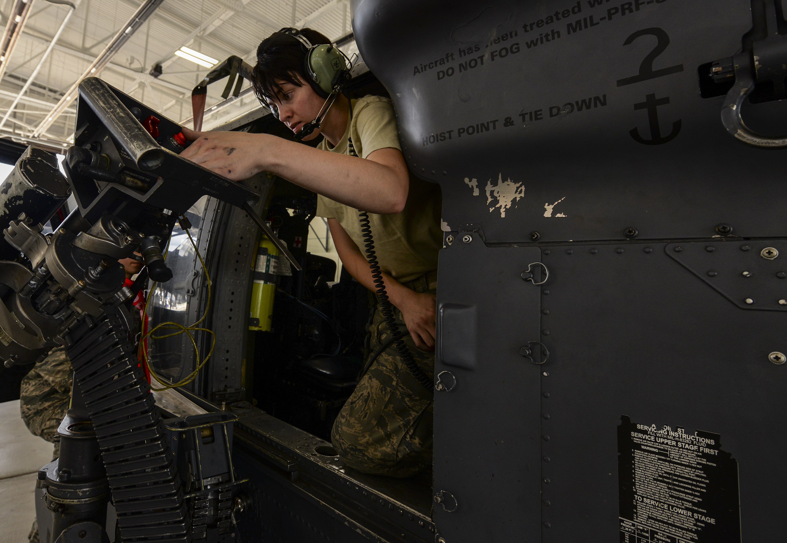 U. S. Air Force Senior Airman Skai Levoy, 41st Helicopter Maintenance Unit, performs an operational check on the firing controls of the GAU-2 7.62mm mini-gun Sept. 11, 2015, at Moody Air Force Base, Ga. Levoy helped the 41st HMU weapons flight defeat the HH-60G Pave Hawk units at Davis-Monthan AFB, Ariz. and Nellis AFB, Nev., to clench first place this quarter. (U.S. Air Force photo by Airman 1st Class Janiqua P. Robinson/Released)