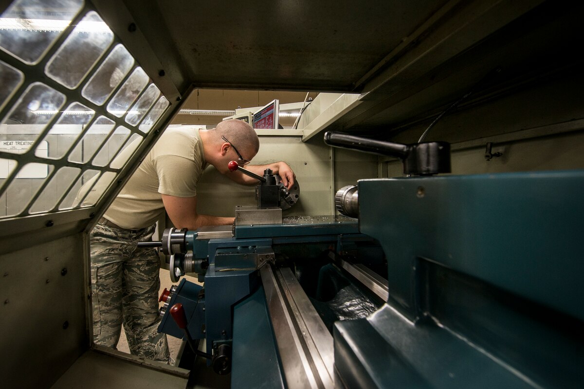U.S. Air Force Senior Airmen Mark Jensen, 23d Equipment Maintenance Squadron aircraft metals technology journeyman, measures a fitting used on aircraft crew doors at Moody Air Force Base, Ga., April 30, 2014. Each part requires strict, precise measurements to be used on an aircraft. (U.S. Air Force photo by Airman 1st Class Ryan Callaghan/Released)