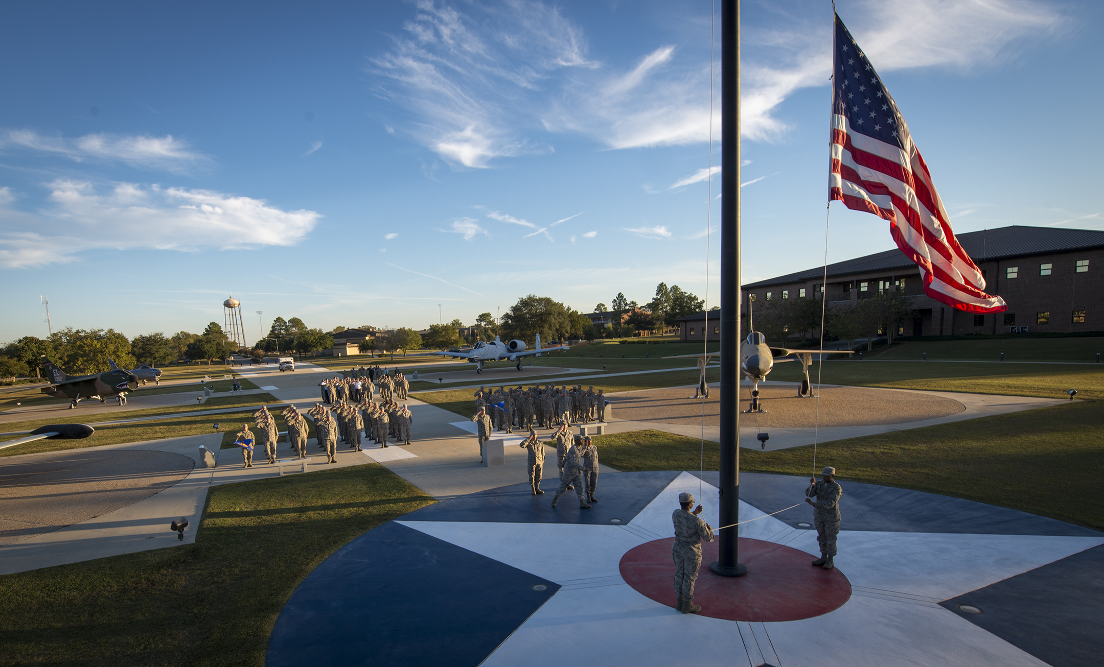U.S. Air Force Airman 1st Class Shannon Winthrop, left, 23d Communications Squadron network administrator, and Airman 1st Class Taylor Wells, 23d CS client systems technician, stand at the front of a flag detail and two flights of Airmen at Moody Air Force Base, Ga., Nov. 8, 2013. The detail ceremoniously lowered and folded the flag to honor veterans. (U.S. Air Force photo by Airman 1st Class Ryan Callaghan/Released)