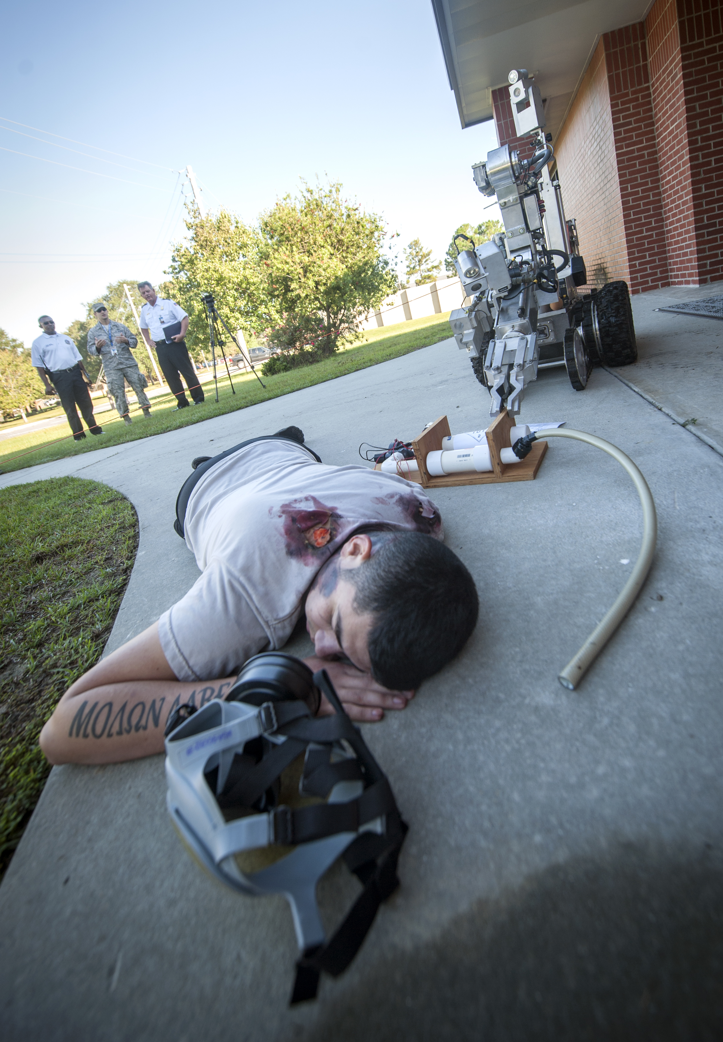 Emergency medical personnel check U.S. Air Force Airman 1st Class Jacob Adams’, 23d Security Forces Squadron, blood pressure during a major accident response exercise at Moody Air Force Base, Ga., Sept. 27, 2013. As part of the exercise scenario, four people were killed and eight wounded from chlorine gas. (U.S. Air Force photo by Senior Airman Jarrod Grammel/Released)