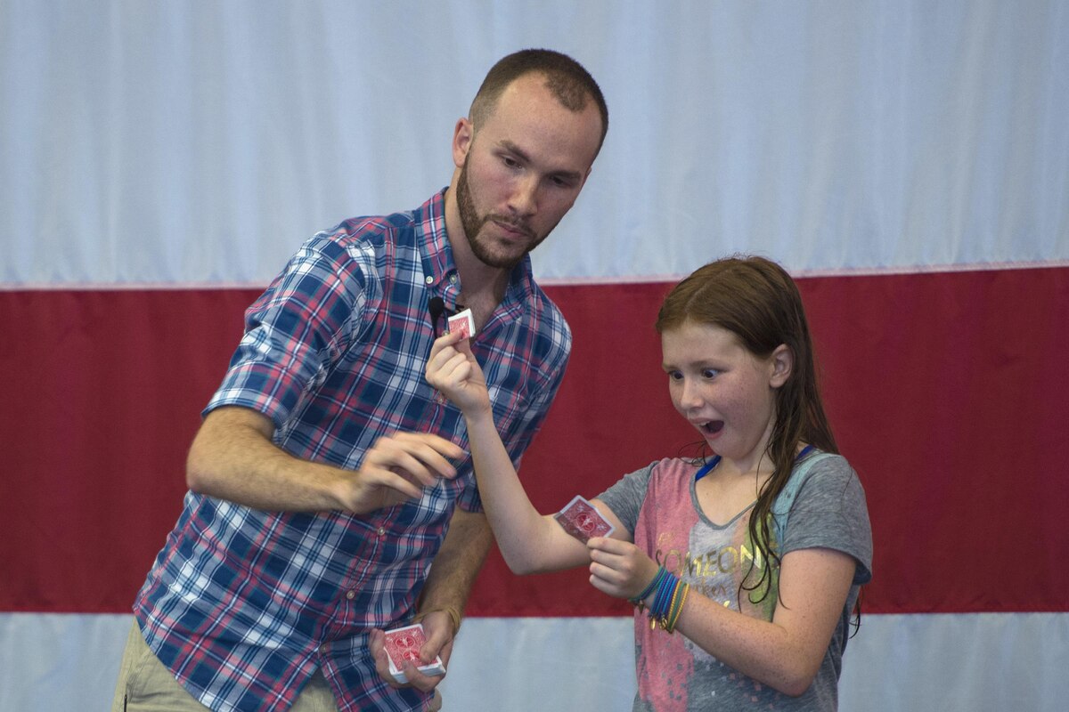 Alexis Walker, daughter of U.S. Air Force Col. Kevin Walker, 820th Base Defense Group commander, reacts to a card trick from local magician, Robert Lee Amaral, at the End of Summer Bash, July 29, 2016, at Moody Air Force Base, Ga. Amaral showcased several magic tricks integrating kids and their parents with card tricks, illusions and dart throwing. (U.S. Air Force photo by Airman 1st Class Greg Nash)