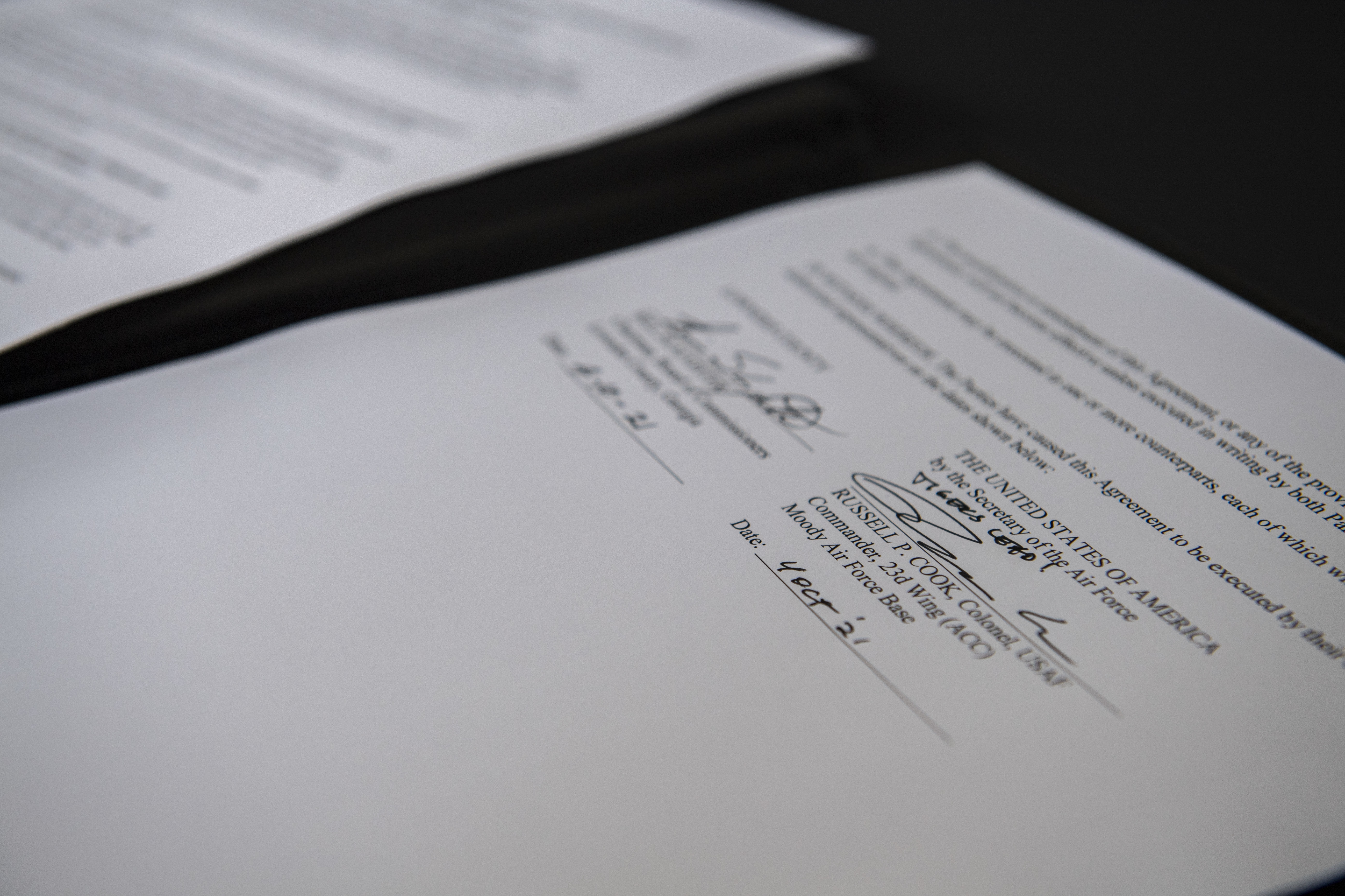 Meghan Barwick, the public information officer for Lowndes County, Georgia, takes a photograph of U.S. Air Force Col. Russ Cook, 23rd Wing commander, and Chairman Bill Slaughter, Lowndes County Commission, signing an agreement for automatic aid between fire and emergency services of Moody Air Force Base, Georgia, and Lowndes County on Oct 4, 2021. This agreement is aimed to increase the speed of response and build community and base partnerships. (U.S. Air Force Master Sgt. Daryl Knee)
