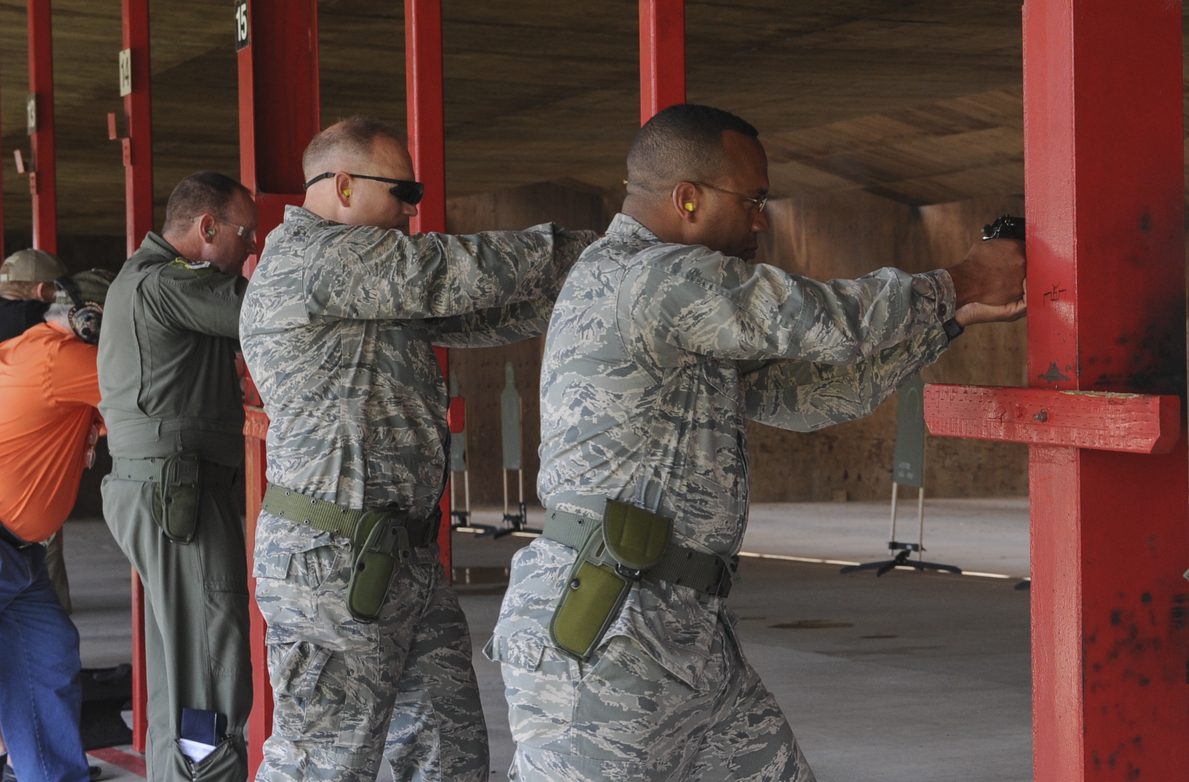 U.S. Air Force Col. Alvis Headen, 23d Medical Group commander, and Col. Jeffery Decker, 23d Maintenance Group commander, fire their weapons at Moody Air Force Base, Ga., May 15, 2013. Headen and Decker participated in a shooting competition in honor of police week. (U.S. Air Force photo by Airman Alexis Grotz/ Released)