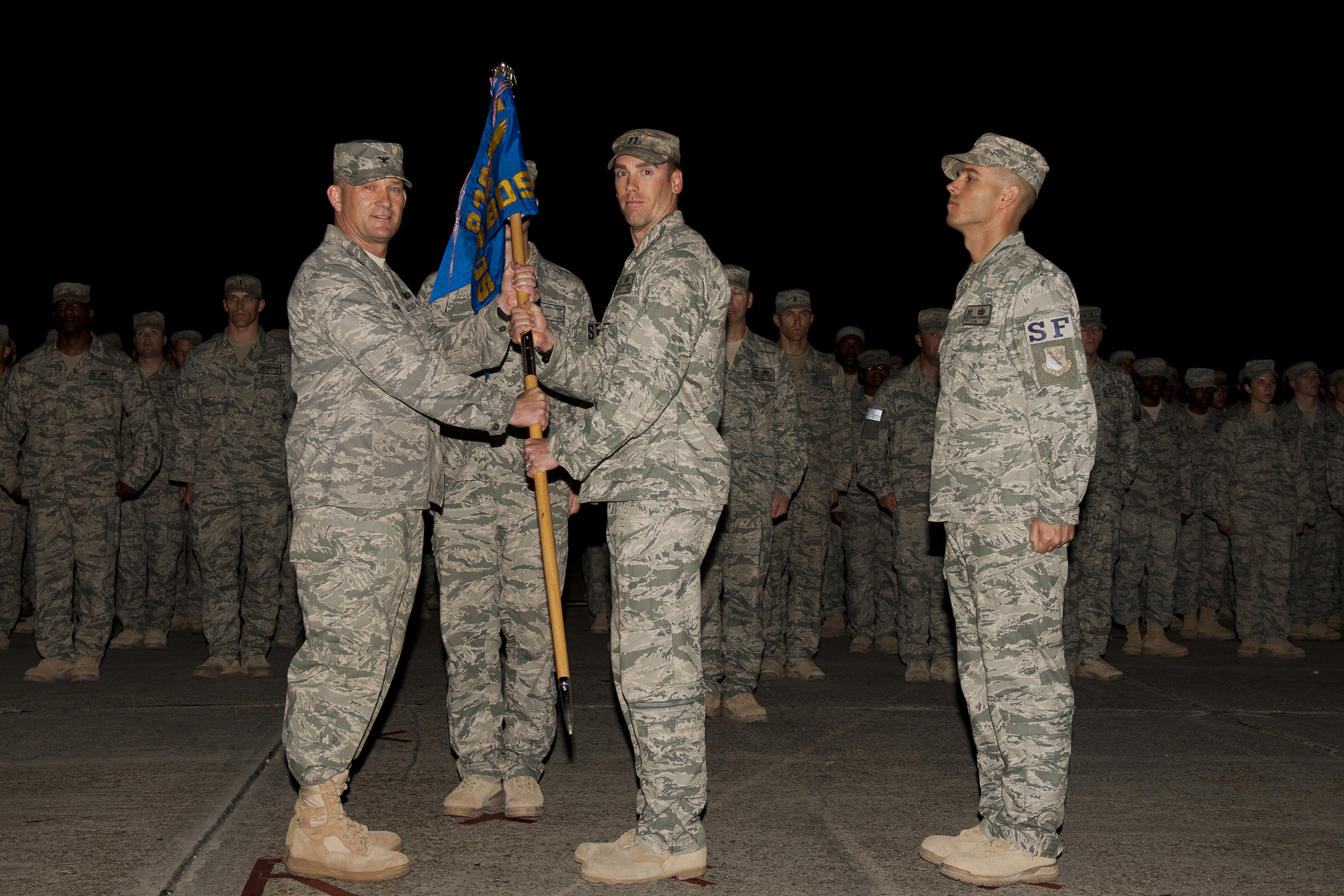 U.S. Air Force Col. Randall Richert, 820th Base Defense Group commander (left), hands the 824th Base Defense Squadron guidon to the incoming commander Capt. Brandon McKinnon (right) during a change of command ceremony at Moody Air Force Base, Ga., June 11, 2011. The outgoing commander Lt. Col. Brint Woodruff (far right) relinquished command after serving two years as squadron commander, with the last six months being in Afghanistan. (U.S. Air Force photo by Airman 1st Class Joshua Green/Released)