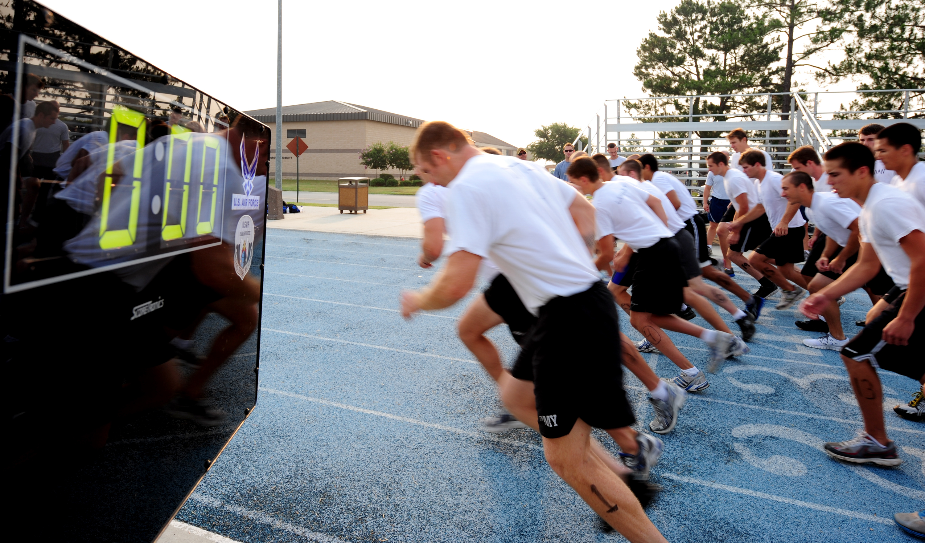 U.S. Air Force recruits begin the 1.5-mile run portion of a physical ability and stamina test during Battlefield Airman Camp held at Moody Air Force Base, Ga., June 10, 2011. The program coordinated by the 336th Recruiting Squadron and special operations liaison officer helps prepare future special operations Airmen by mentally preparing them for the intensive training they will endure. (U.S. Air Force photo by Senior Airman Stephanie Mancha/Released)