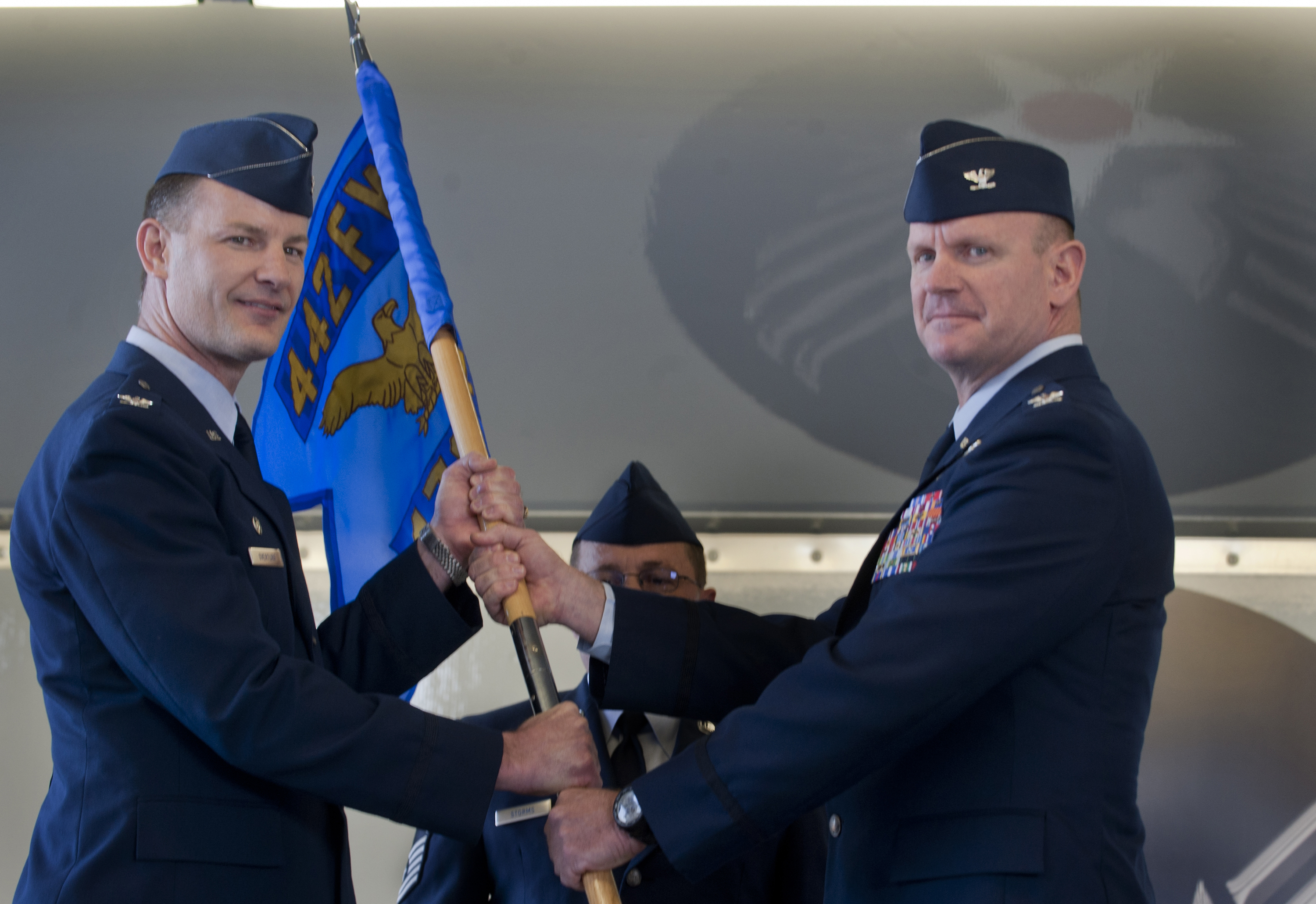 MOODY AIR FORCE BASE, Ga. -- Col. Eric Overturf, 442nd Fighter Wing commander, hands the guidon to the new 476th Fighter Group commander, Col. Christian Funk, during a change of command ceremony May. 7. Colonel Funk was previously the Aviation Tactics Evaluation Group deputy commander and director of staff at Fort Bragg, N.C. (U.S. Air Force photo/Airman 1st Class Douglas Ellis)(RELEASED)