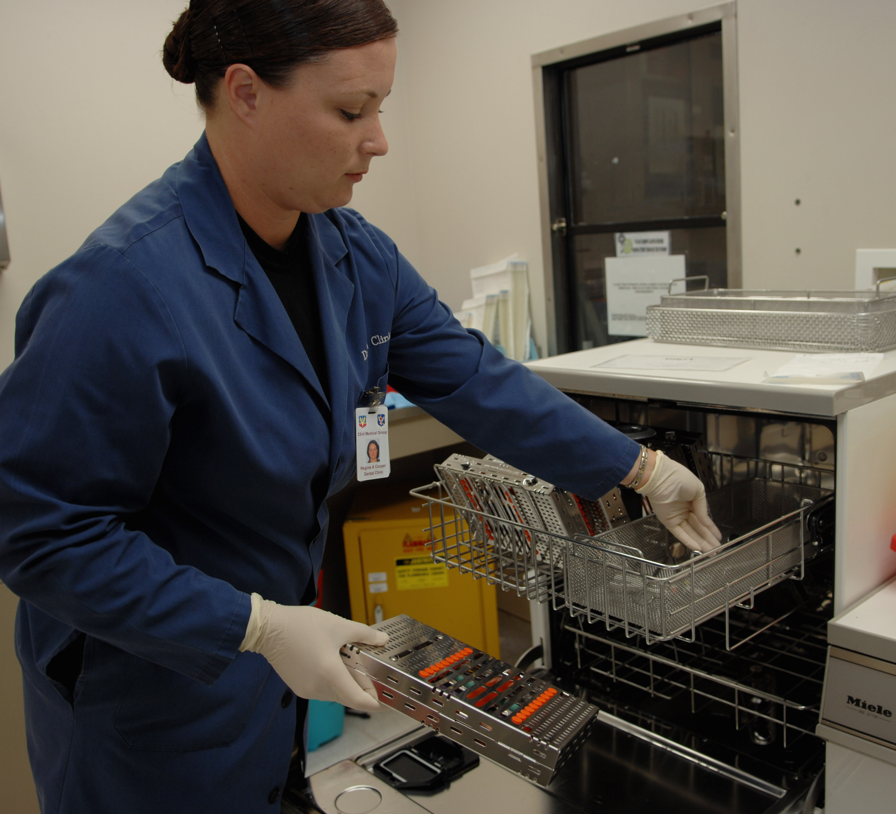 MOODY AIR FORCE BASE, Ga. – Staff Sgt. Regina Cooper, 23rd Aero-medical Dental Squadron NCO In-Charge of central serial, places hand-held utensils and tool packs into a disinfectant wash to sterilize them here March 7. Every utensil is sterilized each time it's common packaging has been opened. (U.S. Air Force photo by Senior Airman Angelita Lawrence)