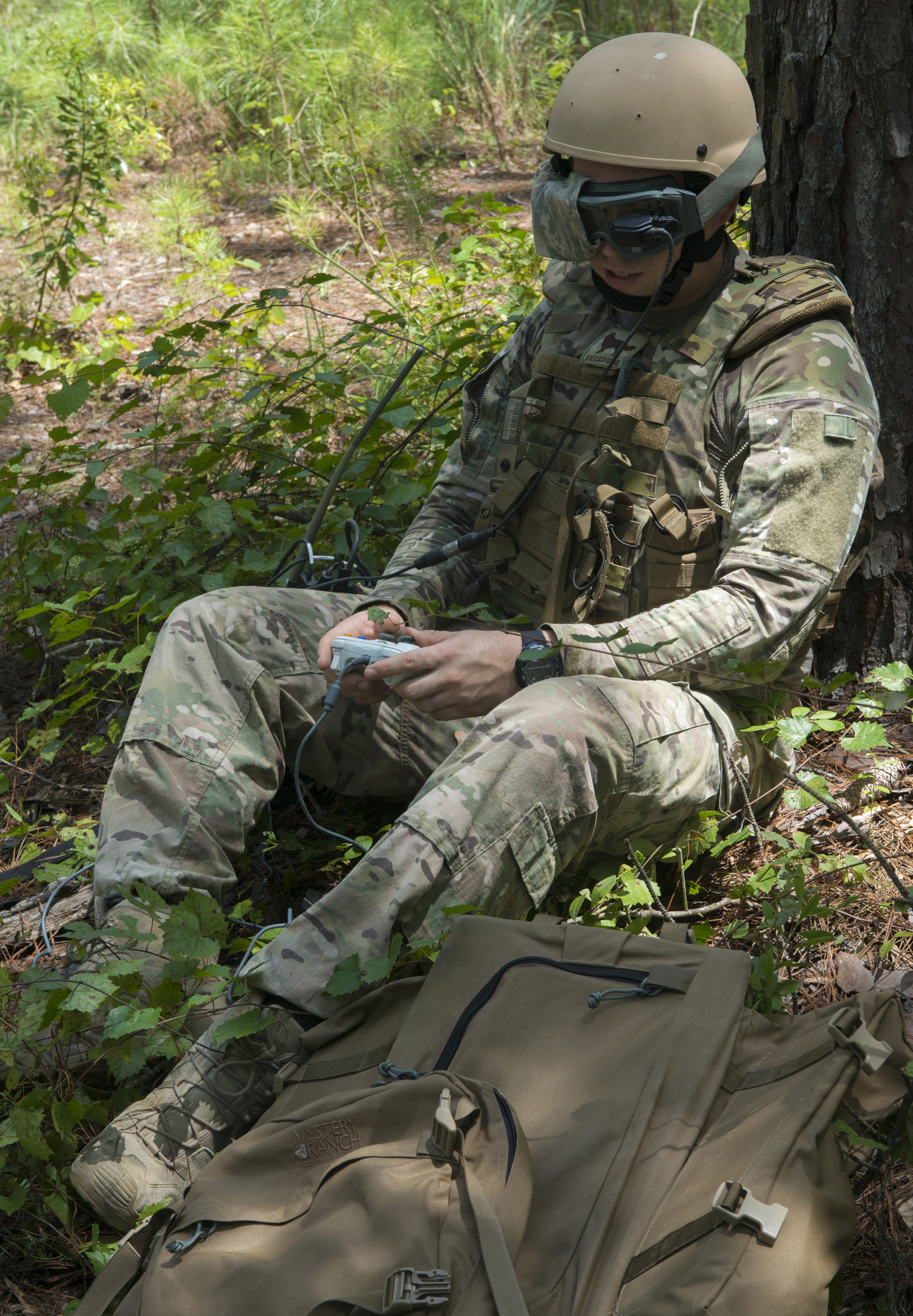 U.S. Air Force Staff Sgt. Daniel Esselstrom, 23d Civil Engineer Squadron explosive ordnance disposal journeyman, operates a small unmanned ground vehicle robot during a wartime dismounted improvised explosive device operation exercise at Moody Air Force Base, Ga., Aug. 20, 2013. Esselstrom controlled the robot with a standard video game controller and a heads-up display attached to his goggles. (U.S. Air Force photo/Airman 1st Class Ryan Callaghan/Released)