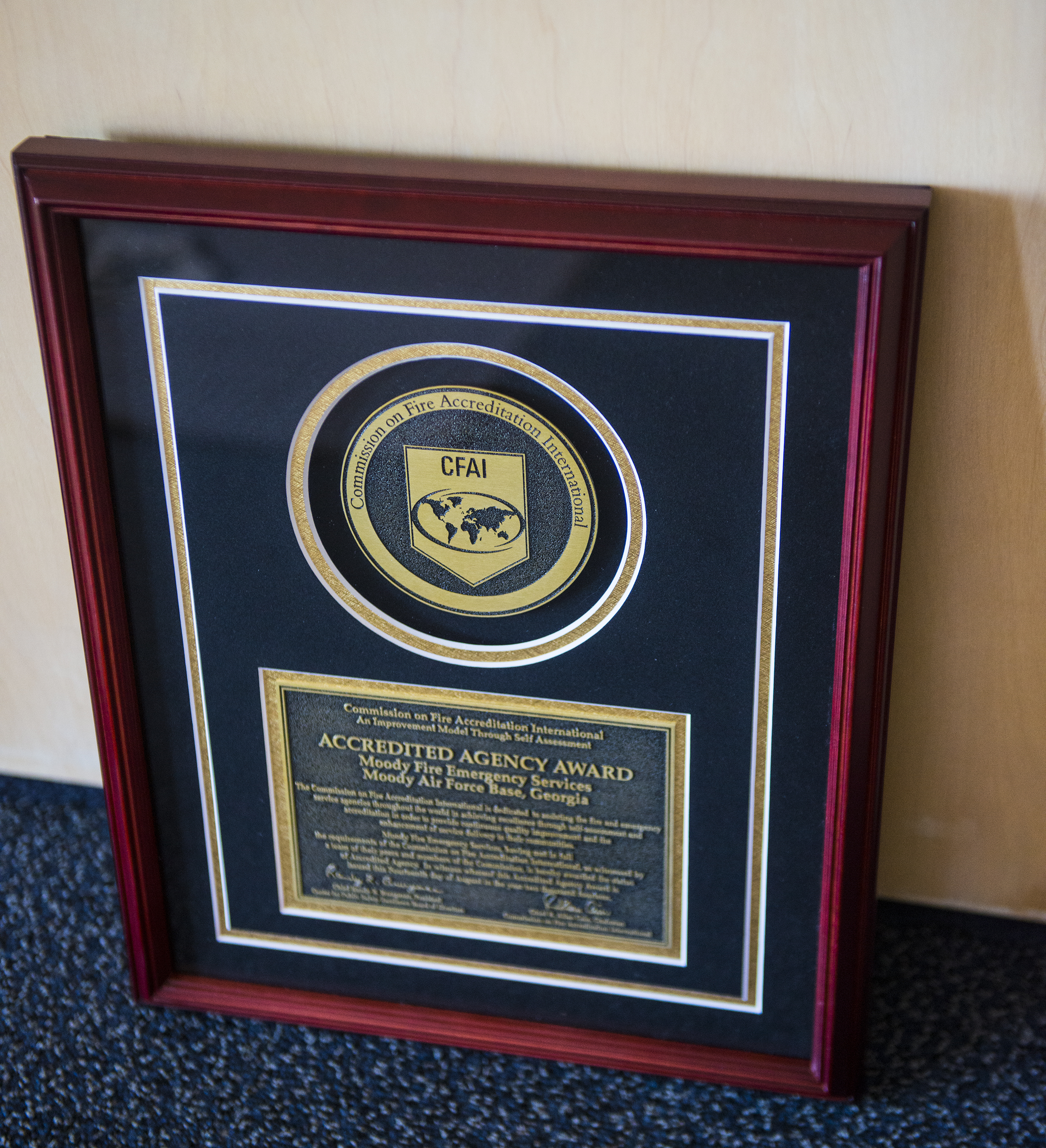 A Commission on Fire Accreditation International plaque rests at Moody Air Force Base, Ga., Aug. 21, 2014. Moody firefighters received the award and currently rank sixth in the Air Force in fire and rescue agencies within CFAI’s standrads. (U.S. Air Force photo by Airman 1st Class Ceaira Tinsley/Released)