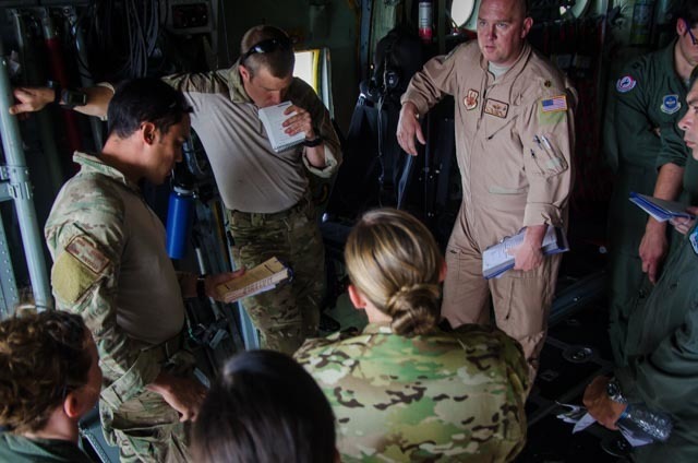 U.S. Air Force Maj. Neil Harlow, with the 153rd Airlift Wing, gives an aircraft commander’s briefing to Airmen assigned to the 38th Rescue Squadron out of Moody Air Force Base, Ga., and aircrew from the Wyoming Air National Guard’s 153rd Airlift Wing June 7, 2015, prior to take off aboard a C-130 Hercules aircraft at Davis-Monthan Air Force Base, Ariz. The aircraft commander’s briefing was given to ensure the flight crew was informed and in sync for their upcoming mission. The mission was conducted as part of Angel Thunder 2015, the world’s largest personnel recovery exercise, hosting 11 partner nations and nine inter-agencies. (U.S. Air National Guard photo by Tech. Sgt. John Galvin/Released)