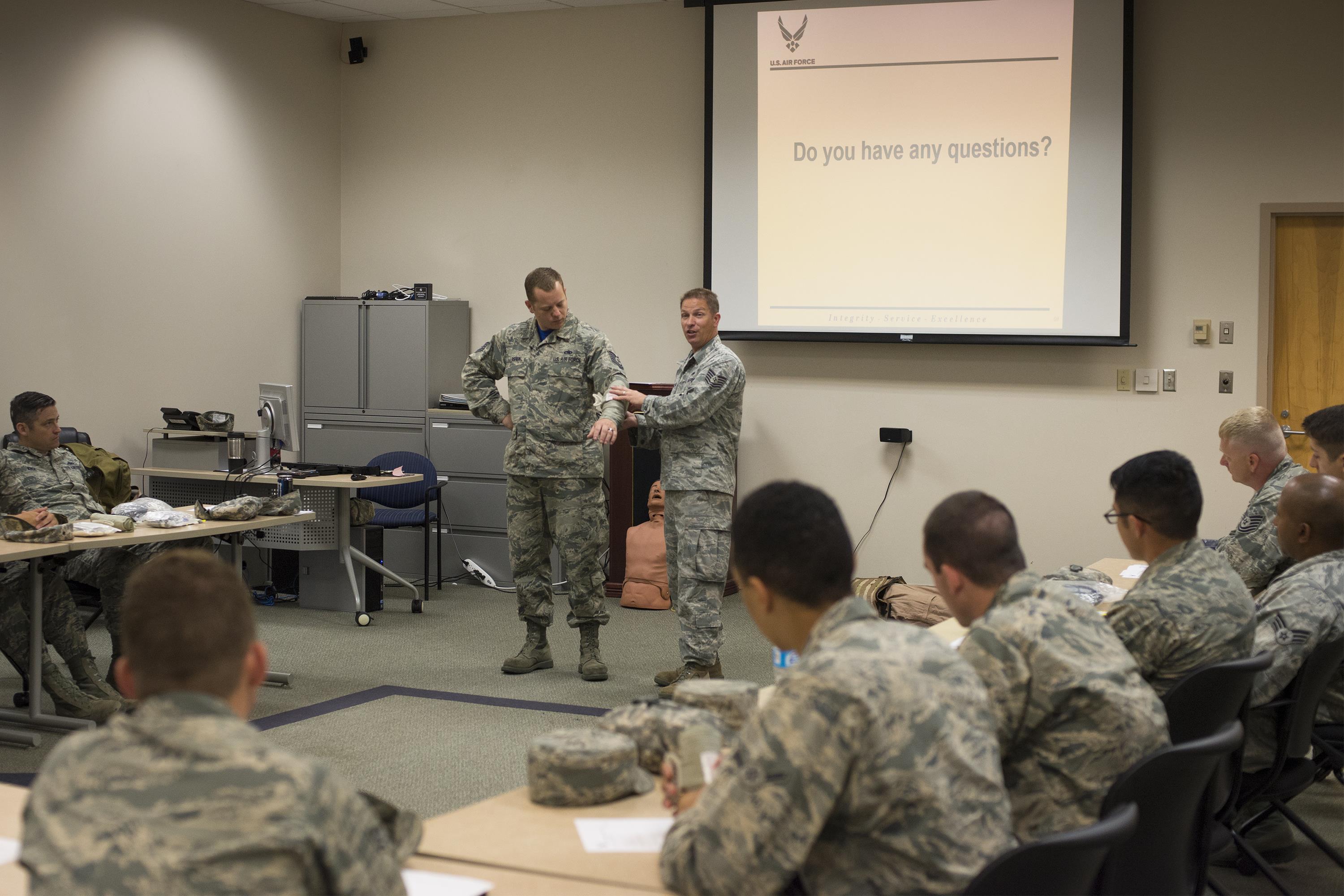 U.S. Air Force Tech. Sgt. Kevin Strickland, 23d Maintenance Operations Flight, and Tech. Sgt. David Asher, 23d Aircraft Maintenance Squadron, both self-aid buddy care instructors, demonstrate proper use of emergency bandages, May 13, 2016, at Moody Air Force Base, Ga. Using combat gauze and bandages correctly helps blood clot more quickly and could possibly save a life. (U.S. Air Force photo by Airman Daniel Snider/Released)
