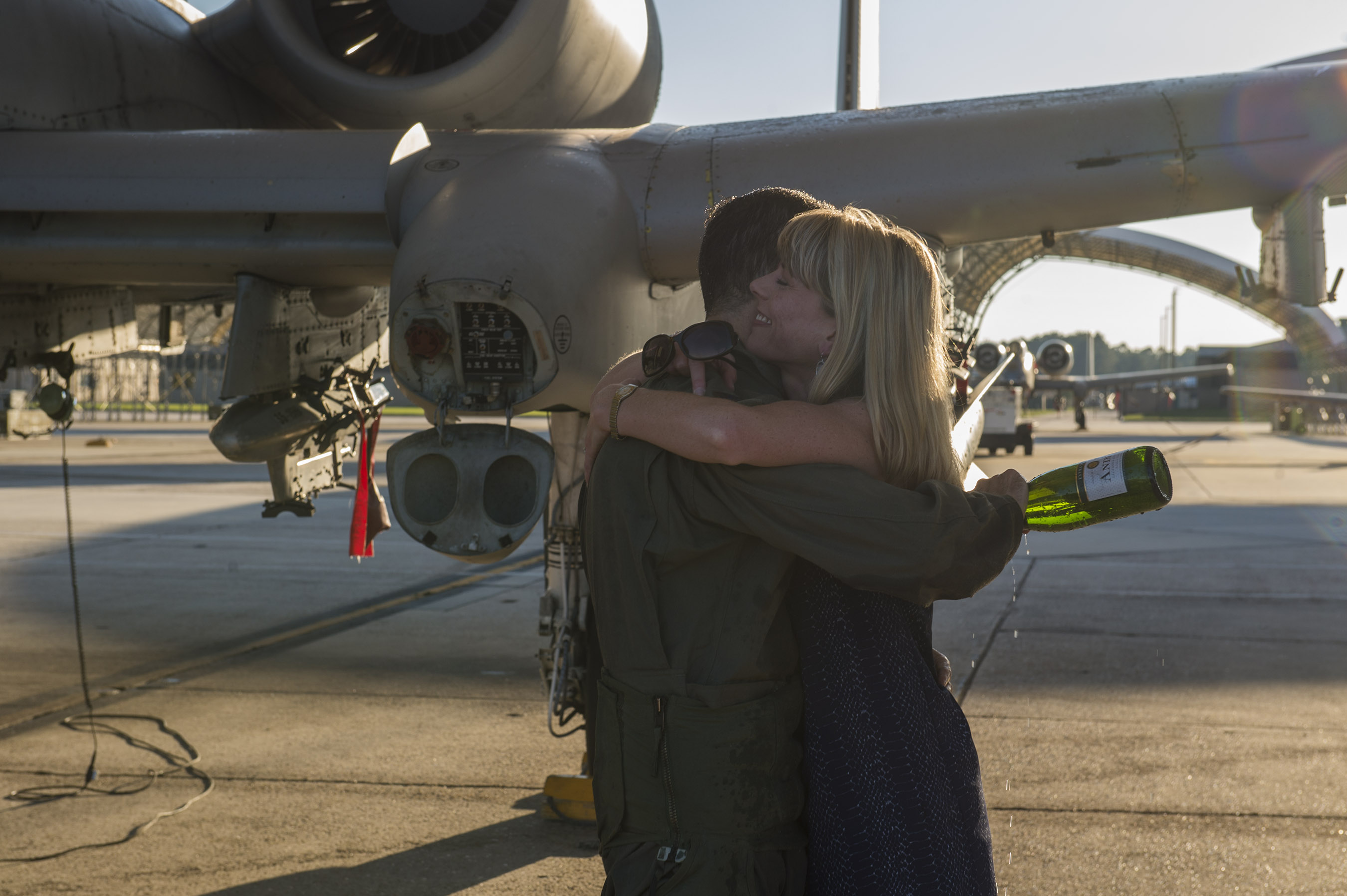 Col. Mark Barrera, 23d Wing vice commander, embraces his wife after completing his fini flight from Moody Air Force Base, Ga., May 15, 2017. Upon completion of their final flights, military aviators are hosed down with water by their comrades, family, and friends before they depart their squadron. Barrera will continue his Air Force career by attending the Joint Military Attaché School to become an Air Attaché in Italy. During this tenure, he will act as an embassy liaison with host-nation defense establishments, openly observe and report developments and significant events, and actively participate in national security and operational policy development and coordination. Upon completion of their final flights, military aviators are hosed down with water by their comrades, family, and friends before they depart their squadron. Barrera will continue his Air Force career by attending Italy’s Joint Military Attaché School to become an Air Attaché. During this tenure, he will act as an embassy liaison with host-nation defense establishments, openly observe and report developments and significant events, and actively participate in national security and operational policy development and coordination. (U.S. Air Force photo by Senior Airman Greg Nash)